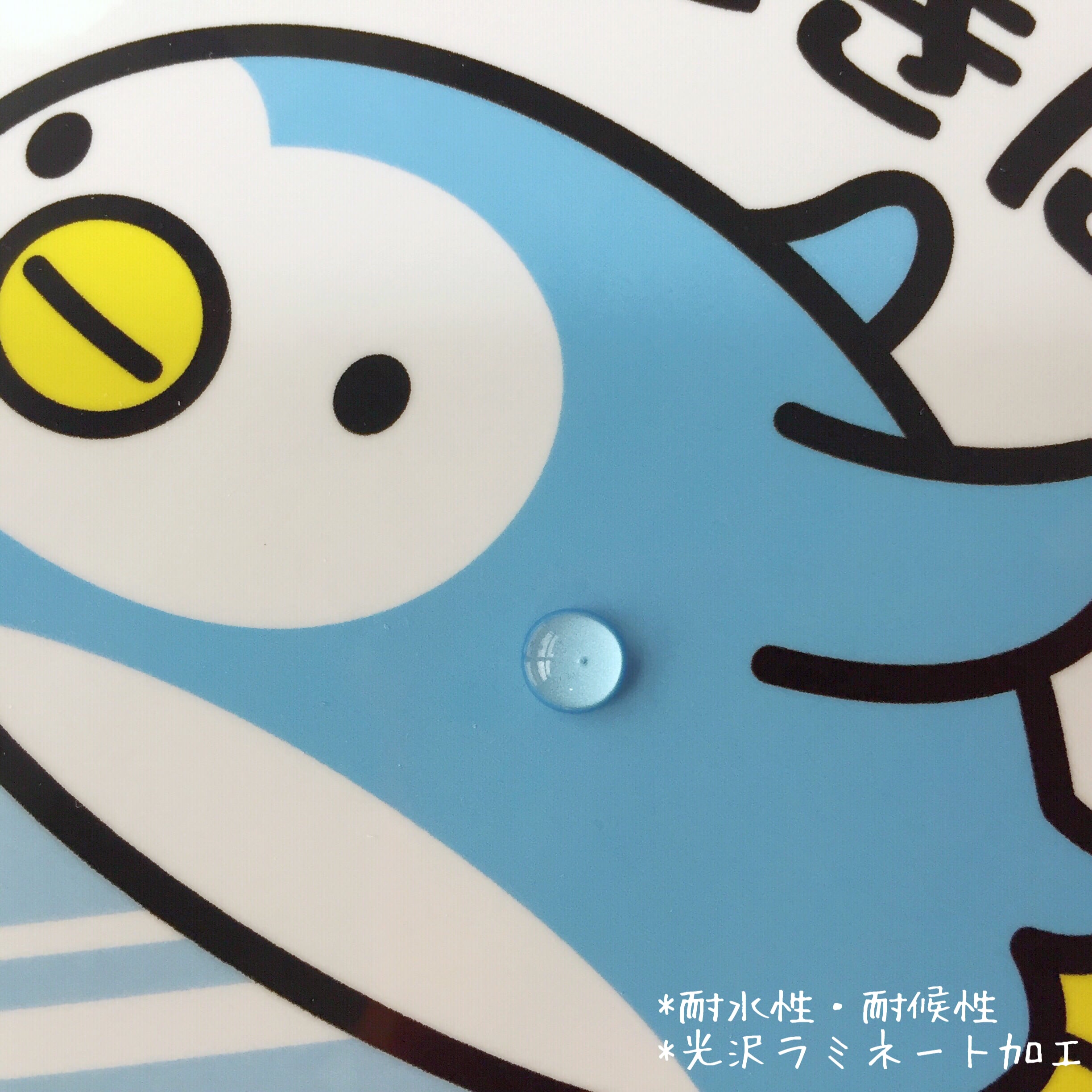 シールは屋外用ですので、雨風や直射日光UVに強い、耐水性・耐候性で、表面は美しい光沢ラミネート加工です。