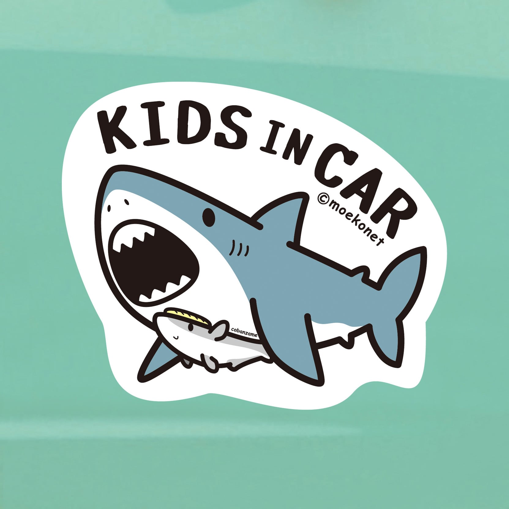 ホホジロザメに小さなコバンザメがくっついた「KIDS IN CAR」可愛いイラストステッカーです。